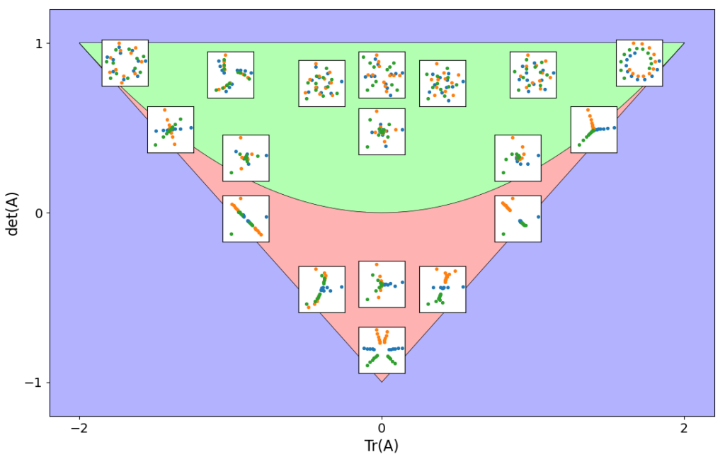 Interestingly, this criterion defines a triangular region on the \((\mbox{Tr} A, \mbox{det} A)\)-plane, sometimes referred to as the ‘stability triangle.’ This triangle is represented hereabove, together with a few sample trajectories produced by systems corresponding to points within it. Analogous to the continuous-time PoincarĂ© diagram, oscillatory behaviors associated with complex eigenvalues occur in the green region, where \((\mbox{Tr} A)^2 < 4\mbox{det} A \). In the red region, only scaling, symmetry flips, and accumulation along eigenvector directions occur.